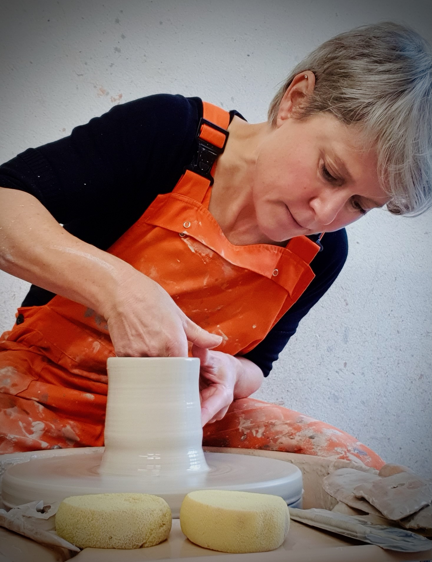Als je aan de pottenbakkersschijf zit, moet je de klei volgen, naar de klei luisteren. Niets overhaast doen. En toch ook kracht gebruiken of op zijn minst zorgen voor een stabiele, stevige houding. Die combinatie is rustgevend en werkt inspirerend. Op die manier hoop ik gebruiksvoorwerpen en objecten te maken die voor verbinding zorgen.
