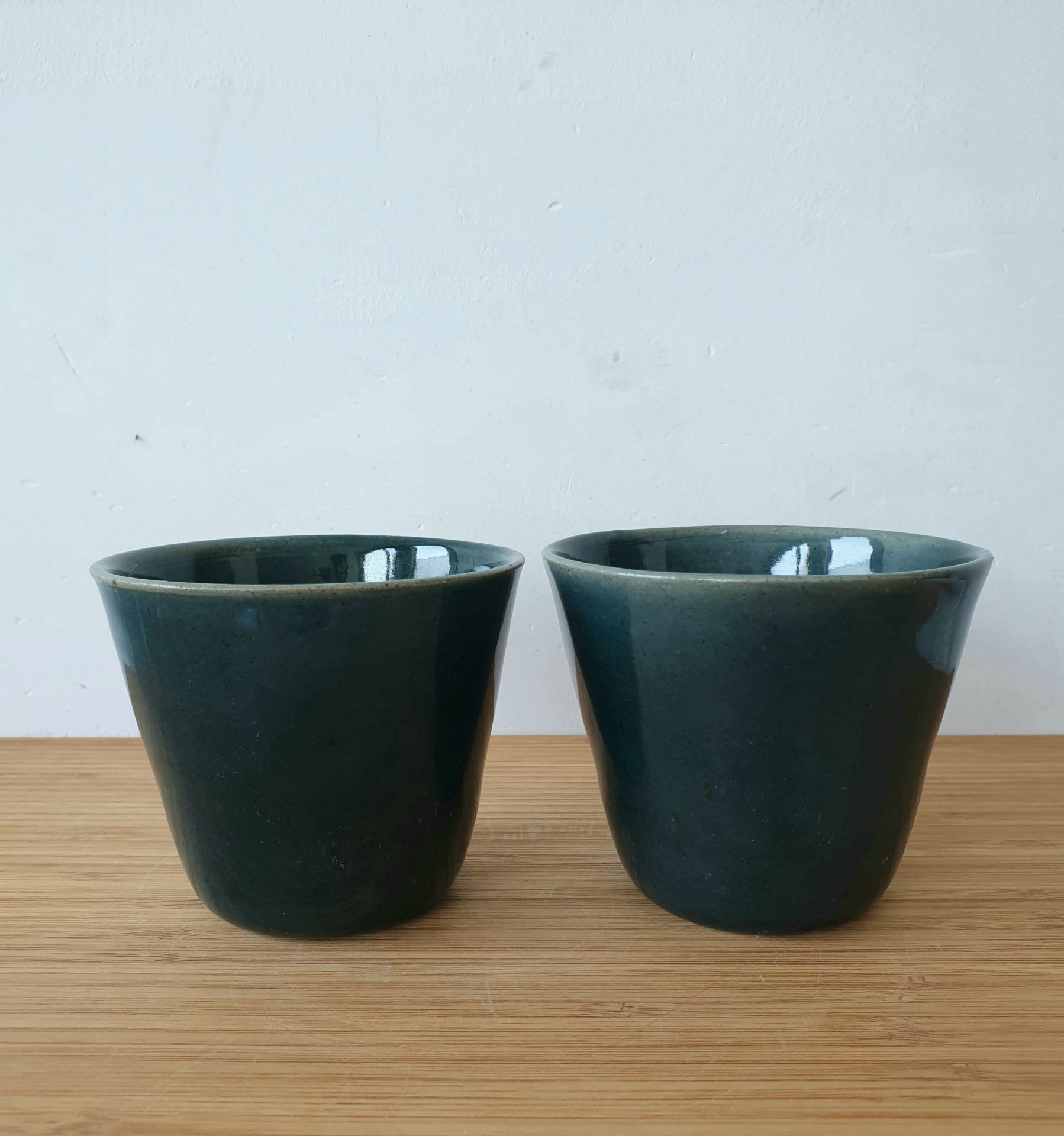 De kopjes hebben een zachte knik. Het transparante glazuur versterkt de natuurlijke kleur van de gebruikte klei. Het ene kopje is net iets hoger en smaller dan het andere.